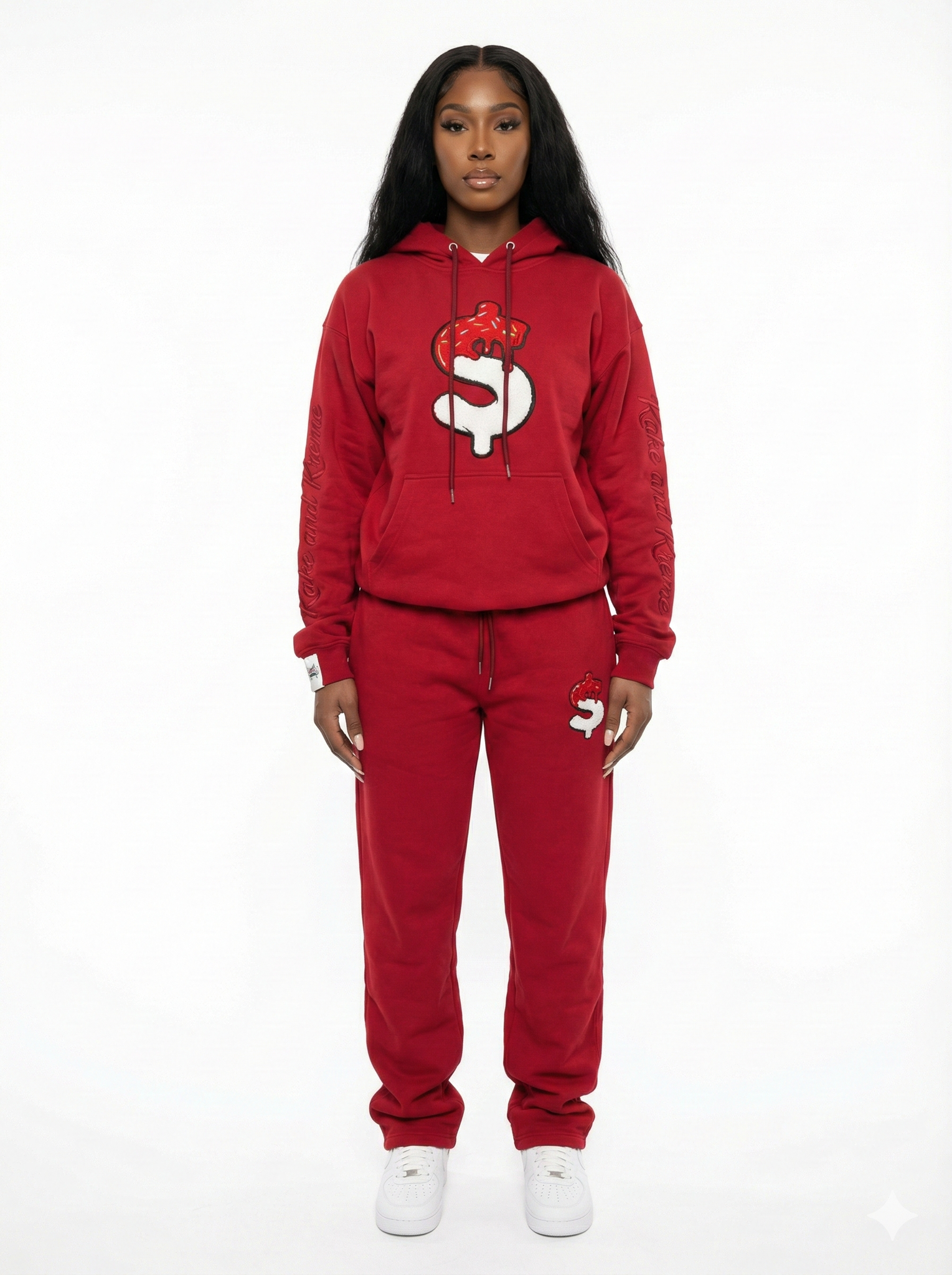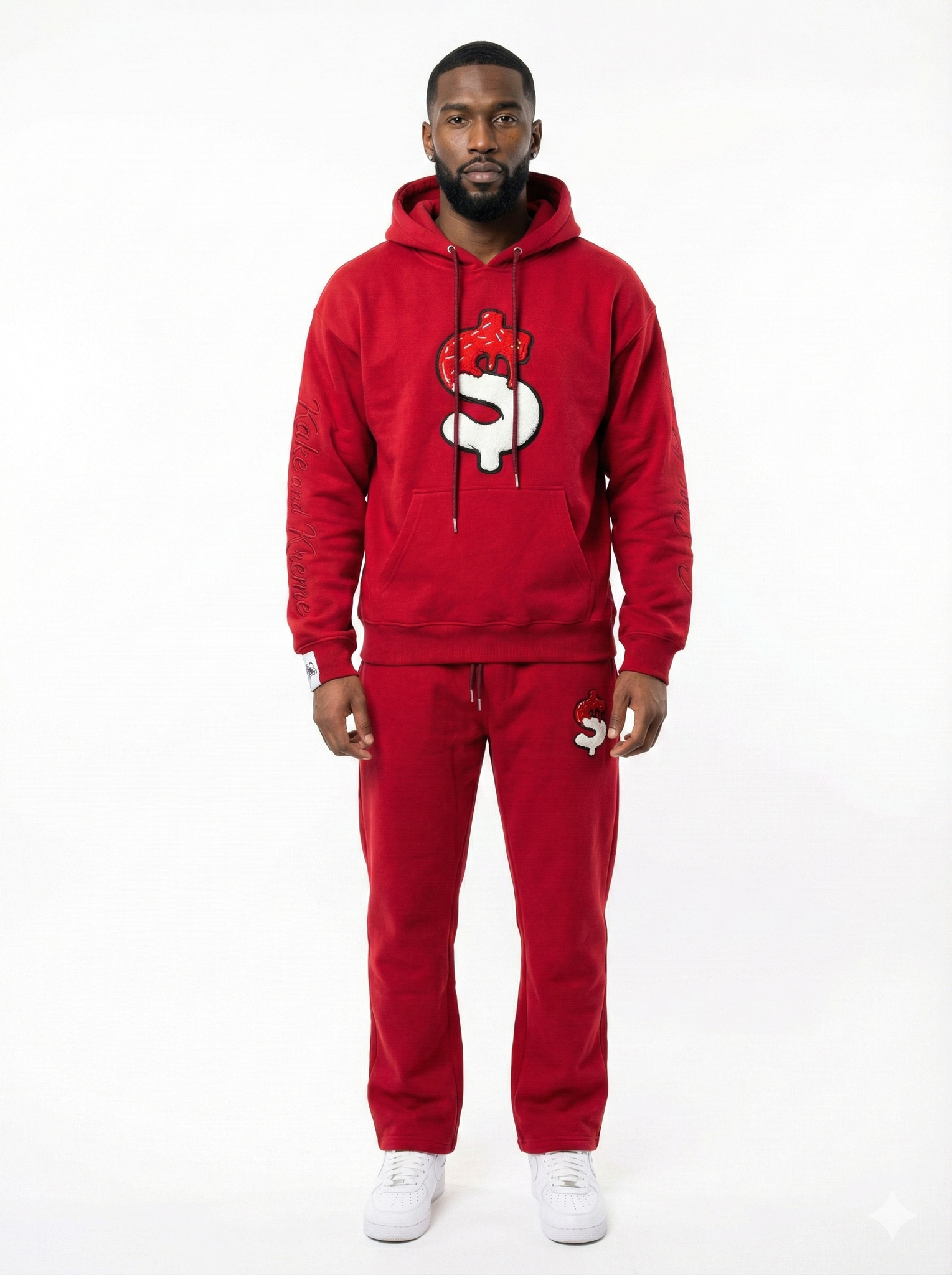 The hoodie features a raised chenille Kake and Kreme logo centered on the chest, delivering a bold, textured finish that stands out. The sweatpants include a matching chenille logo placement on the upper thigh, maintaining a cohesive, premium look from top to bottom.
